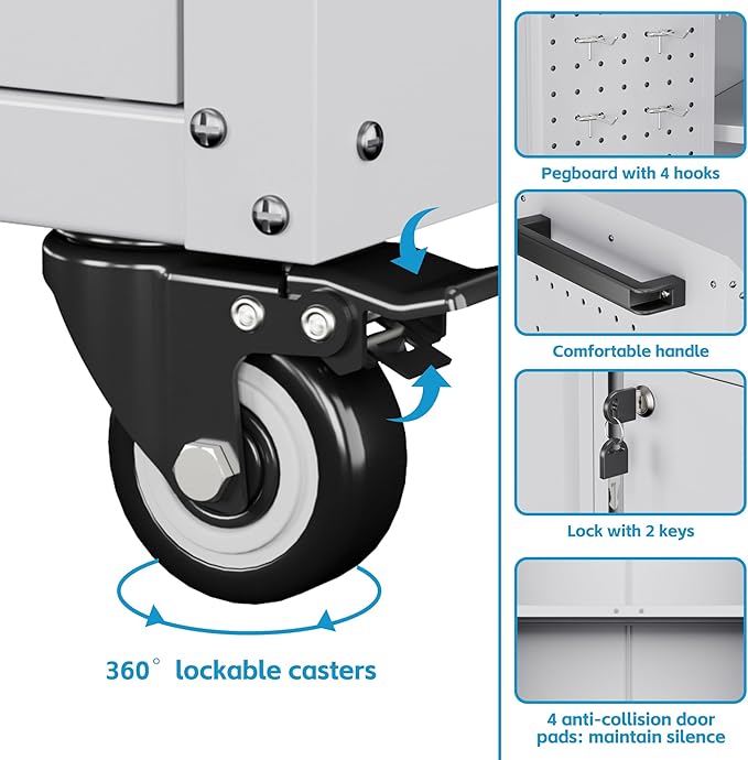 - [Effortless Mobility] Featuring 360Β° swivel silent casters with lockable rubber wheels, our metal storage cabinet moves easily without damaging your floors.